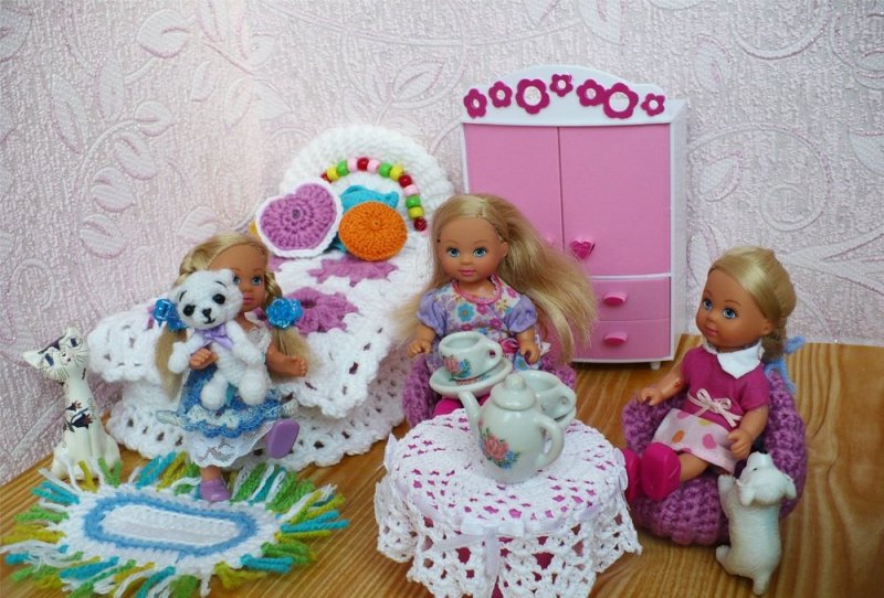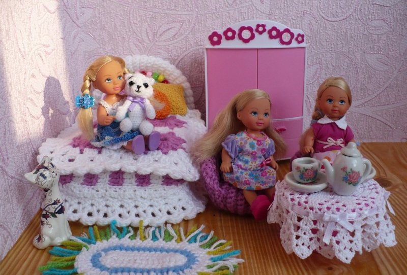 Кроватка с пологом, подзором, кружевным постельным бельем, напоминает предмет для старинной «дворцовой» спаленки. Для изготовления такого предмета изготавливается каркас – прямоугольное основание на ножках, переходящих в стойки, на которых крепится кружевной балдахин. Основа оформляется вязаным матрасиком, с набивкой из поролона, такими же подушечками. Кружевное постельное белье, подзор, изготавливаются отдельно. Стойки также обвязываются при помощи крючка по спирали, их вершины украшаются пышными бантами. Оформление комнатки дополняется люлькой, каркас для которой изготавливается из проволоки или «мюзле» – конструкции, которой закрепляется пробка в бутылке шампанского. Люлька обвязывается кружевами, украшается бантами, цвет которых зависит от пола младенца-пупса, для которого она предназначается. Здесь же придется «в тему» круглый вязаный коврик, камин с вывязанными языками пламени.