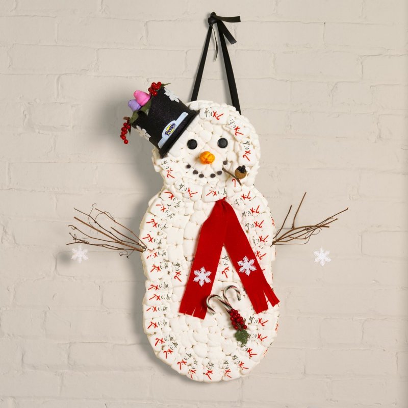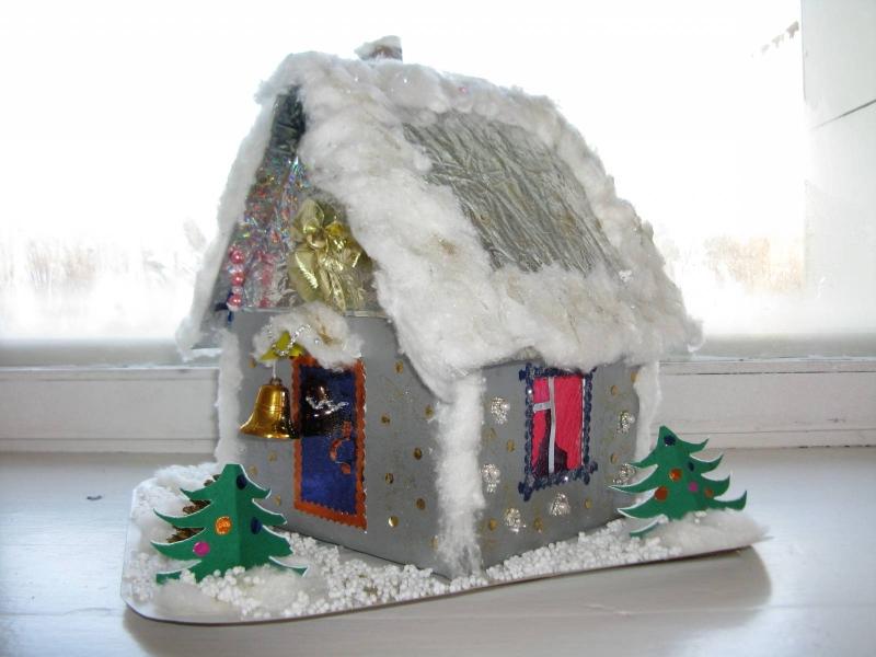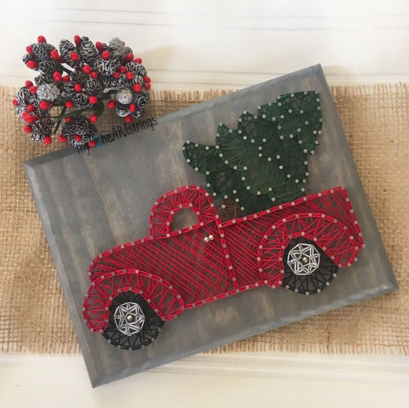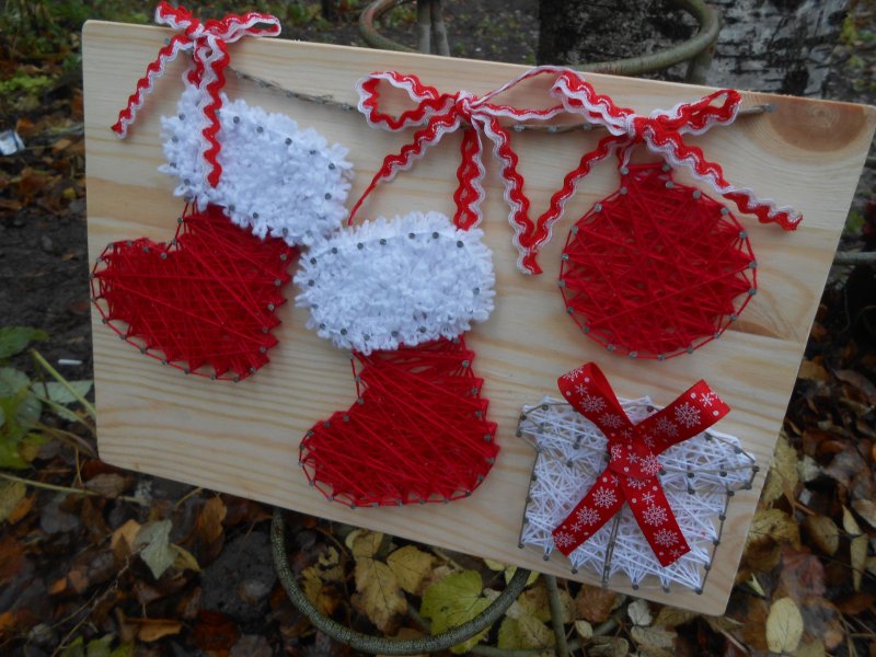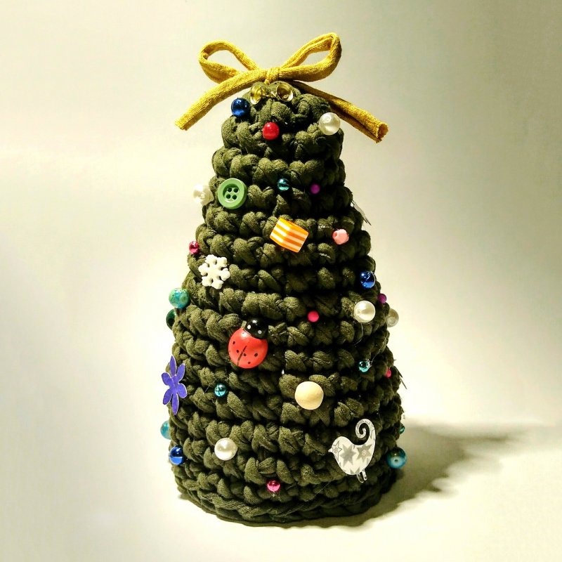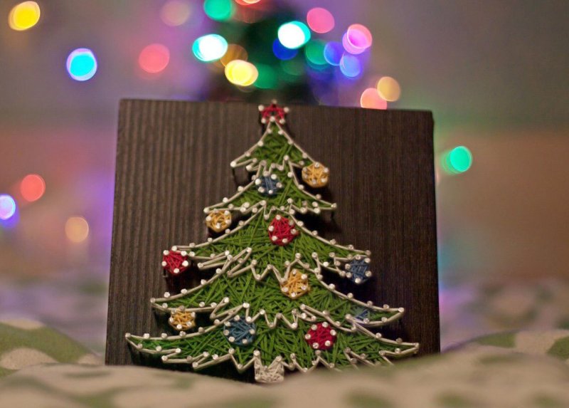 Из картона изготавливается конус. Зеленые нитки (обычные или вязальные) вымачиваются в ПВА. Конус обматывается пищевой пленкой, затем вплотную обматывается нитками. После высыхания елочка снимается с каркаса и украшается.
