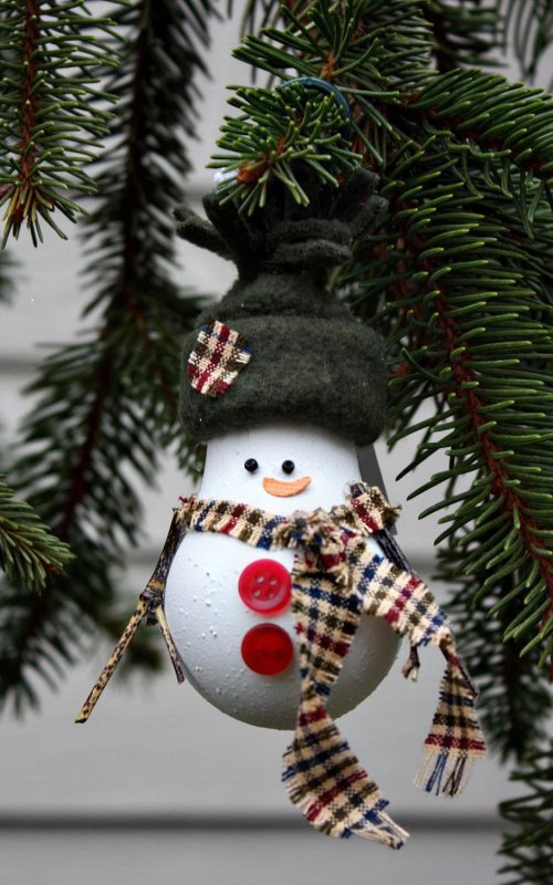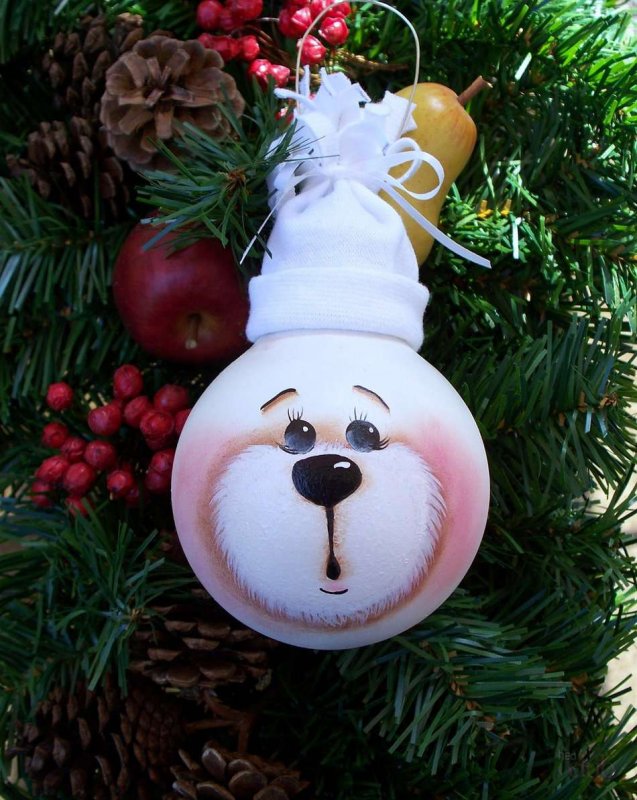 На старых лампах можно нарисовать снеговика, Деда Мороза или Снегурочку, елку. В работе нужно использовать грунтовку и акриловые краски.