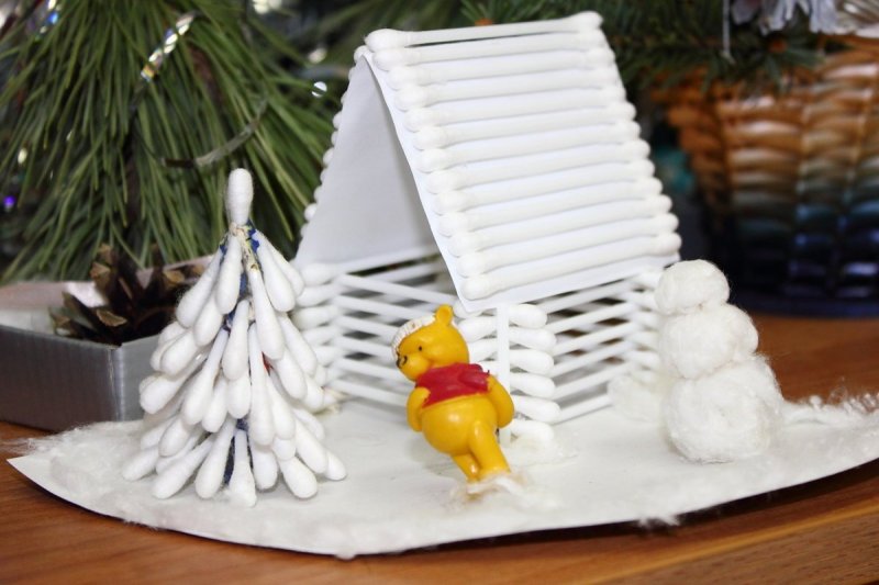 Из веток, ниток и бусин можно сделать маленькие поделки елочки. Из шишек и клея с блестками получатся отличные подвески для украшения дома.