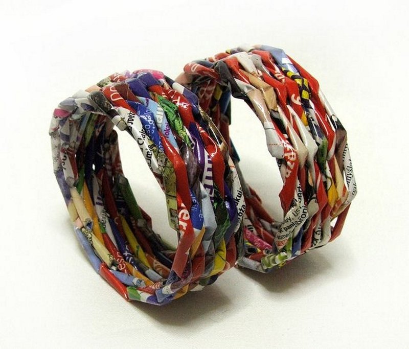 Старые журналы нарезаются полосками шириной в 2 см и длиной в 4-5 см. Каждая полоска сворачивается в свиток (внутри следует оставить небольшое отверстие). Край фиксируется клеем. Подсохшие свитки надеваются на нитку. В зависимости от количества свитков можно сделать как бусы, так и многоярусный браслет.