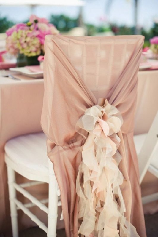 Отличным решением для декора стульев станут накидки из ткани и цветов. Оформление стульев желательно делать в одной цветовой гамме со скатертями. Чехлы из кружев и фатина будут смотреться изысканно и кокетливо.
