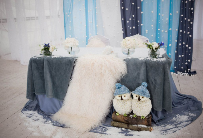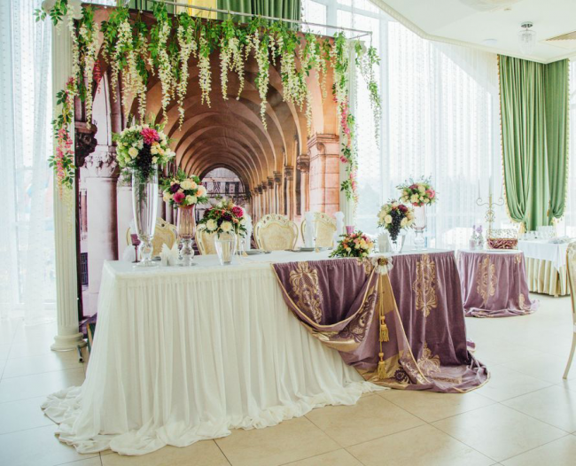 Совет! Для украшения тканью стола можно использовать атлас с кружевом или вышивкой – он смотрится по-королевски шикарно. А для остального декора лучше использовать легкие ткани, так как они прекрасно драпируются и красиво ниспадают волнами. Для закрепления отлично подойдут банты с кружевами.