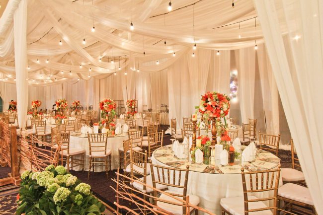 Красивый дорогой текстиль обладает способностью превратить даже самое заурядное помещение в королевский дворец. Тканью украшают столы, драпируют стулья, оформляют стены. Для украшения арок, колонн и лестниц используют атласные ленты. А закрепив отрезы ткани под потолком, можно создать некое подобие шатра.