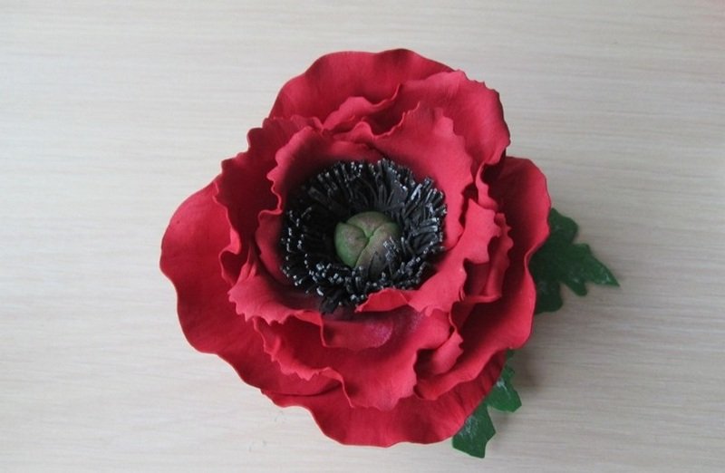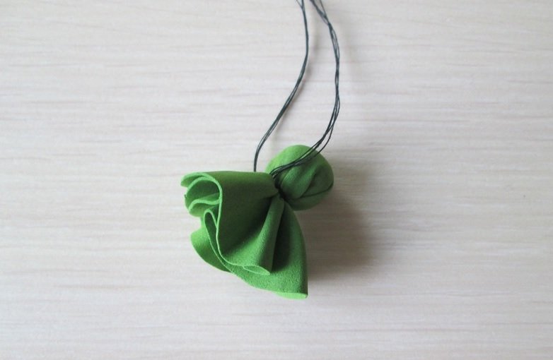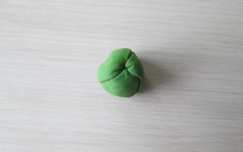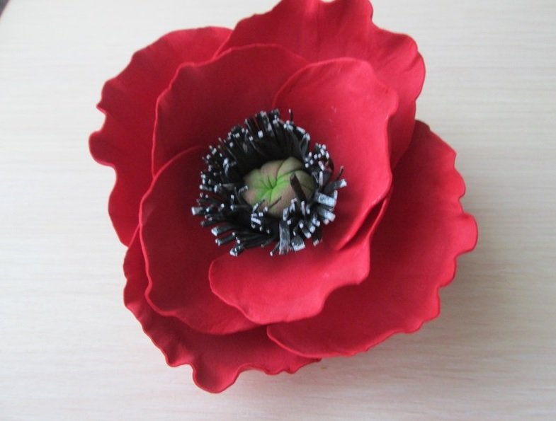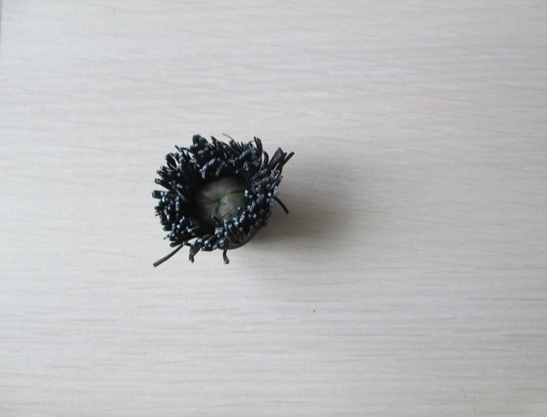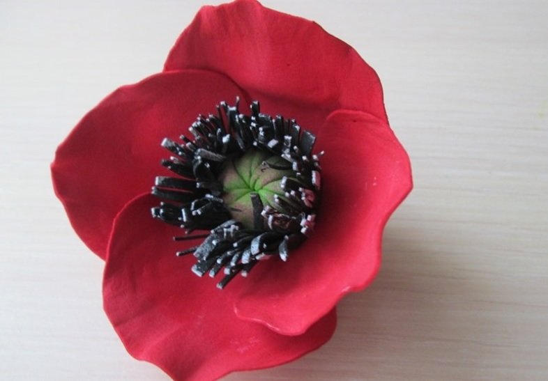 Начинать изготовление мака необходимо с коробочки. Для этого можно использовать глину и зеленую масляную краску. Полимерный материал скатываем в шарик и делаем засечки. Внизу надо продавить маленькое отверстие, наполнить клеем и заложить кусочек проволоки. Если подразумевается изготовление цветочной композиции, подготовить надо сразу несколько коробочек. Затем все глиняные детали отправить в духовку на 5 минут.