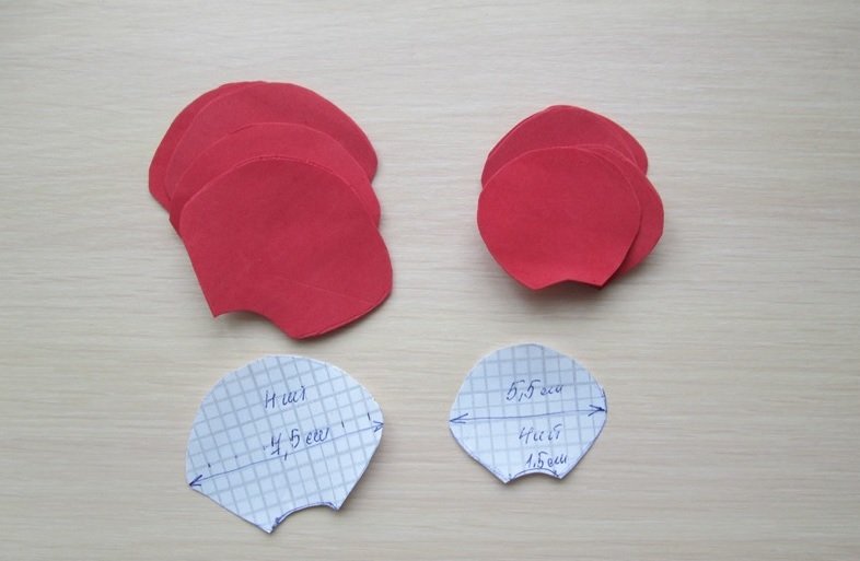 По трафаретам необходимо подготовить три выкройки для лепестков разного размера, диаметром 10, 8 и 6 сантиметров. Круги необходимо поделить на пять равных частей и сформировать овальные лепестки. Затем очертание шаблона переносим на ревелюр любого цвета и вырезаем заготовки.