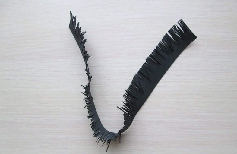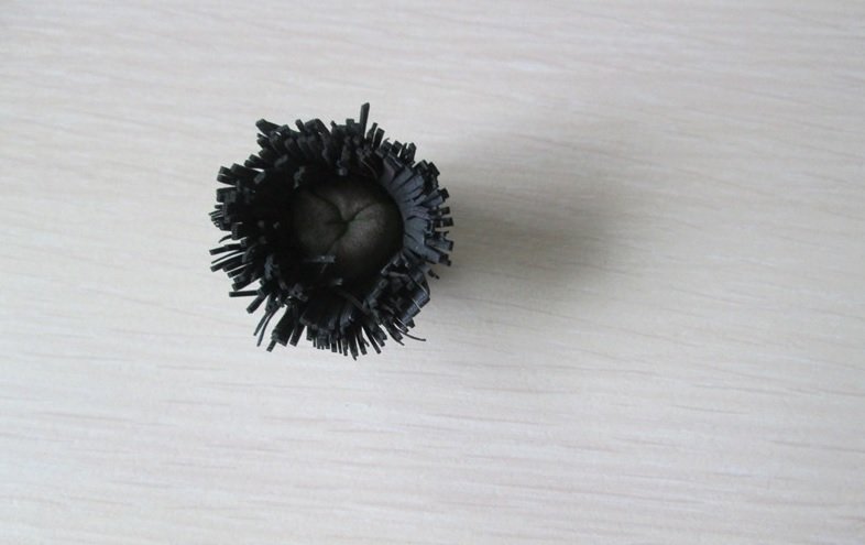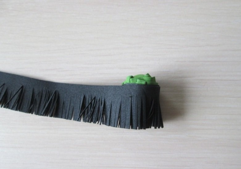 Для тычинок мака необходимо подготовить тонкие полосы черного фоамирана, длиной до 30 см. Затем покрасить салатной пастелью один край с двух сторон и часто нарезать до половины. Чтоб тычинки немного закрутились, их надо нагреть на теплой поверхности утюга.