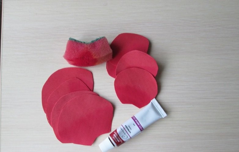 Чтобы сделать самостоятельно цветок мальвы из фоамирана, потребуется минимум времени и материалов. По шаблону в форме вытянутого сердечка необходимо вырезать 5 — 7 лепестков. Чем длиннее заготовки, тем больше будет цветок. Теперь бесцветные элементы надо раскрасить и придать максимальную схожесть с настоящим растением. Верх лепестка красим красным мелком, а низ – желтым. Краску тщательно растираем губкой или салфеткой.