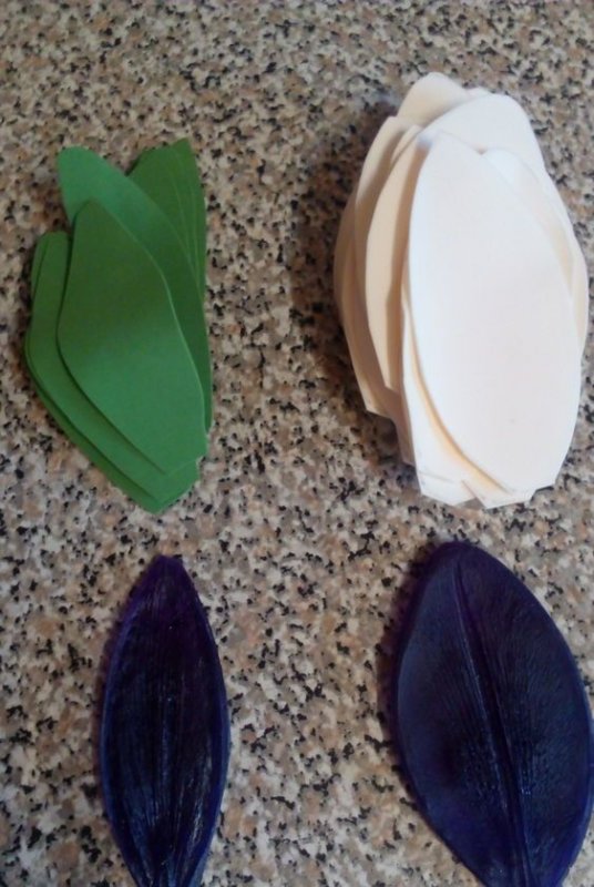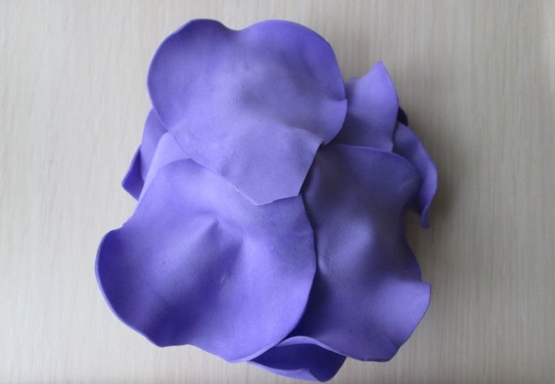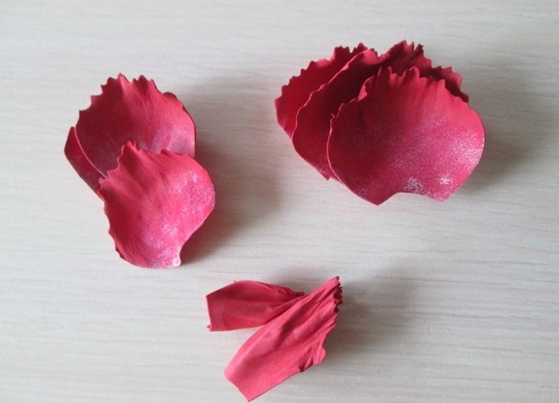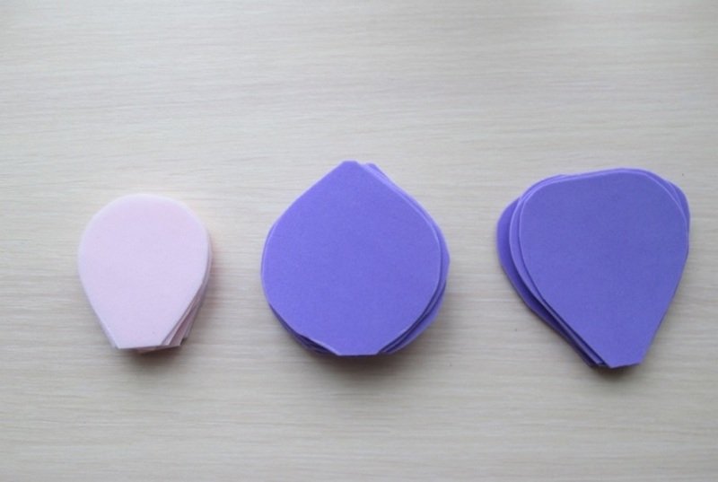 Для изготовления объемного цветка потребуется подготовить как можно больше выкроек лепестков разного размера, небольшие навыки работы с красками. Фоамиран лучше использовать плотный, не менее 2 миллиметров толщиной. Материалом для черновых эскизов послужит картон. Из него вырезаем шаблоны, накладываем на ревелюр и делаем лепестки для четырех рядов, по 10 штук для каждого.