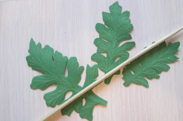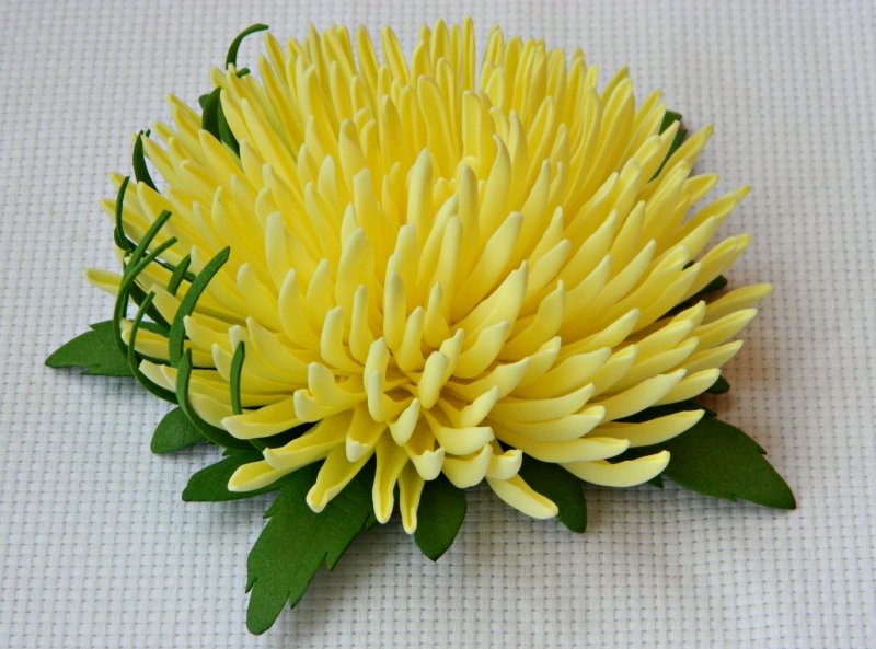 Вырезанные элементы хризантемы, герберы можно немного подкрасить акриловой краской по краям. Цвет – любой. После высыхания заготовки следует переместить на утюг неокрашенной стороной вниз. Сигналом готовности детали будет выгибание краев вовнутрь. Затем их надо размять и расправить. Для сердцевины используют скрученную в трубочку полоску с нарезанной бахромой. Собирают хризантему методом склеивания середины всех лепестков, двигаясь от самого большого элемента к сердцевине. Листы добавляют в последнюю очередь.