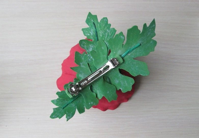 Листья, трилистники, лепестки следует аккуратно вырезать по шаблонам, нанести текстуру. Вогнутую структуру трилистникам можно придать, надавливая в центр пальцем. Зубчатые лепестки получатся, если обработать края алых заготовок ножницами с неровными краями. Выгнутые на молде или вручную детали собираются по следующей схеме крепления к коробочке: