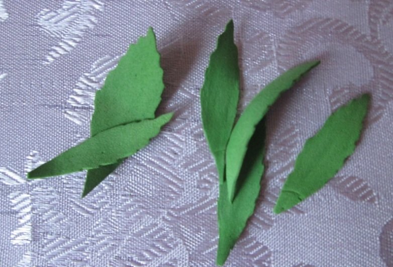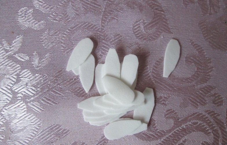 Для изготовления летнего цветка потребуется выдавить на фоамиране 25 лепестков по выкройке. Размер можно выбрать любой, но лучше не делать их длинными, достаточно 5 см в длину и 2 см в ширину. Концы вырезанных деталей для правдоподобности обрабатываем фигурными ножницами.