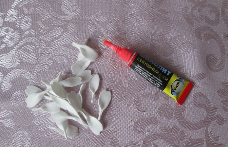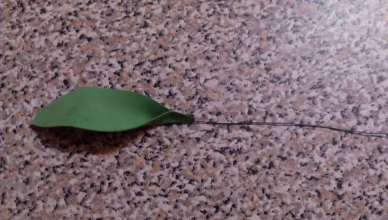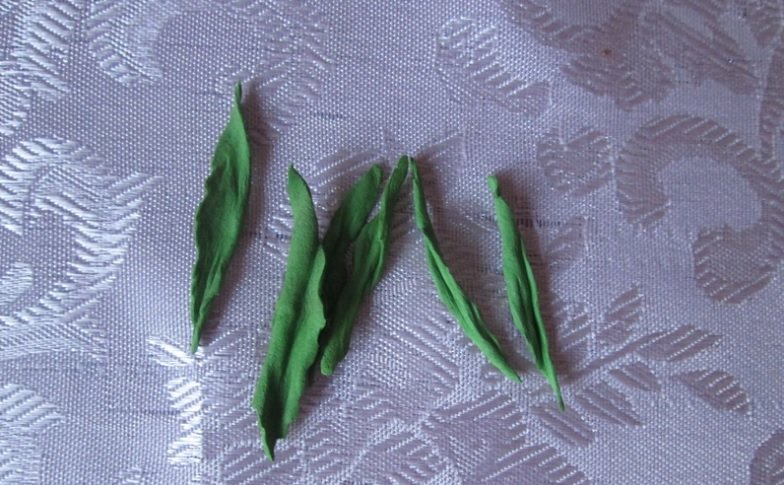 Для формирования изгибов лепестка потребуется нагреть сначала его нижнюю часть – сделать ложбинку, затем верх – хорошо растянуть в стороны. Приклеивать элементы к тычинке необходимо, промазывая самый край основания. Каждый последующий лепесток должен ложиться на середину предыдущего, последний заводится за первый. Место склеивания на тыльной стороне можно спрятать под зеленым листочком.