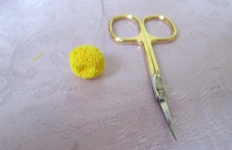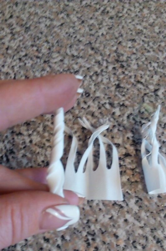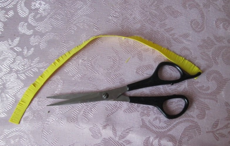 Для середины цветка потребуется желтая полоска пластичного материала, нарезанная бахромой. Промазанную клеем ленту необходимо скрутить трубочкой с небольшим смещением. Чтобы кончики расправились и стали объемными, их следует немного нагреть и распушить пальцами.