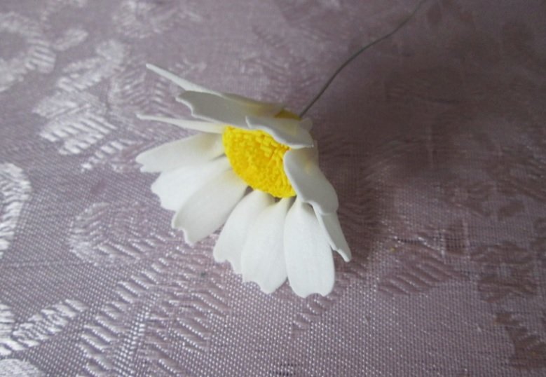 Сборка ромашки начинается с приклеивания семи лепестков к желтому центру. Последующие присоединяем в шахматном порядке. Завершающий этап – подклеивание чашелистика.