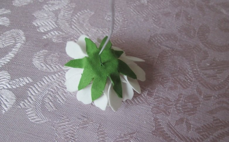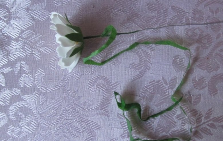 Крепить цветок следует осторожно. Края не должны фиксироваться к центру. Соединять верхние лепестки следует за середину предыдущих, чтобы поделка не распадалась. Невзрачный стебель необходимо окутать зеленой полосой фоамирана и дополнить продолговатыми листьями.