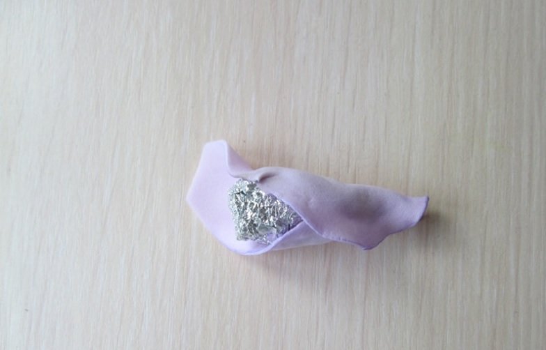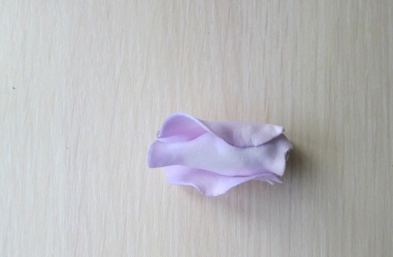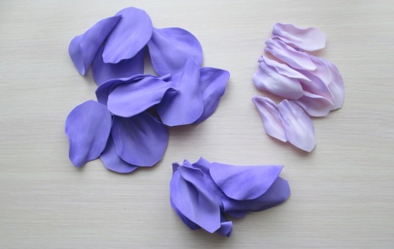 Чтобы цветок выглядел натуральным, края лепестков можно раскрасить пастелью на тон бледнее основного цвета материала. Подготовленные элементы прислоняем к утюгу и продавливаем середину каждой его части. Края выпуклых лепестков необходимо немного закрутить.