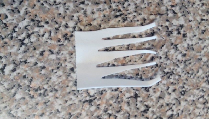 Первым делом создается выкройка. На бумаге необходимо нарисовать шаблоны всех деталей. Цветок для заколки будет состоять из семи лепестков, три из которых крупнее остальных, одной полоски — 6 см в длину и 1 см в ширину, треугольника со сторонами 2 см. Цвет фоамирана можно выбрать любой, но лучше остановиться на белом.