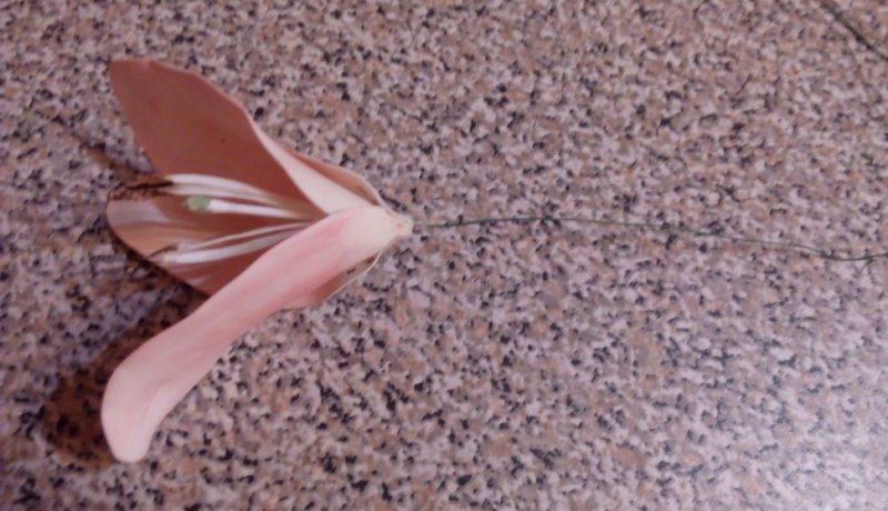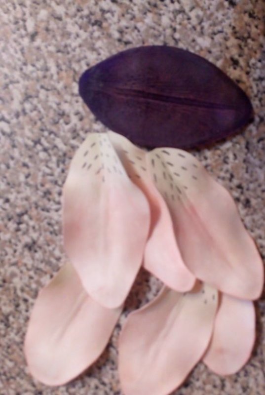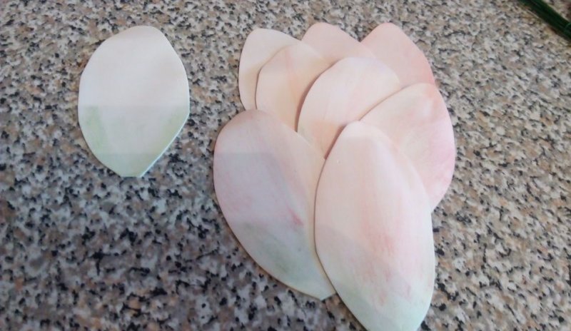 Шаблоны прикладываем к материалу и отмечаем его границы. Вырезаем лепестки и начинаем их обработку на молде при помощи утюга. Если вспомогательного элемента нет, можно просто сложить их гармошкой, истончить пальцами, нанести текстуру зубочисткой. Все детали должны быть одинаково тонированы бледно-розовым цветом. Можно использовать краски или сухую пастель. Затем все лепестки нагреваются, вытягиваются волнами и крепятся на подготовленные литоны. Пестики можно сделать из кусочков фоамирана, клея и молотого кофе.