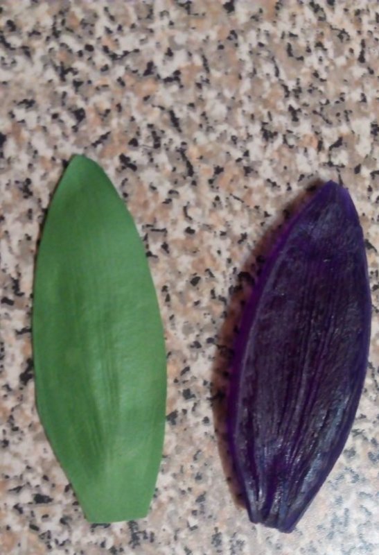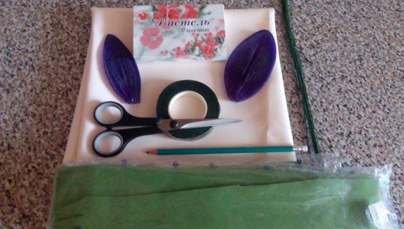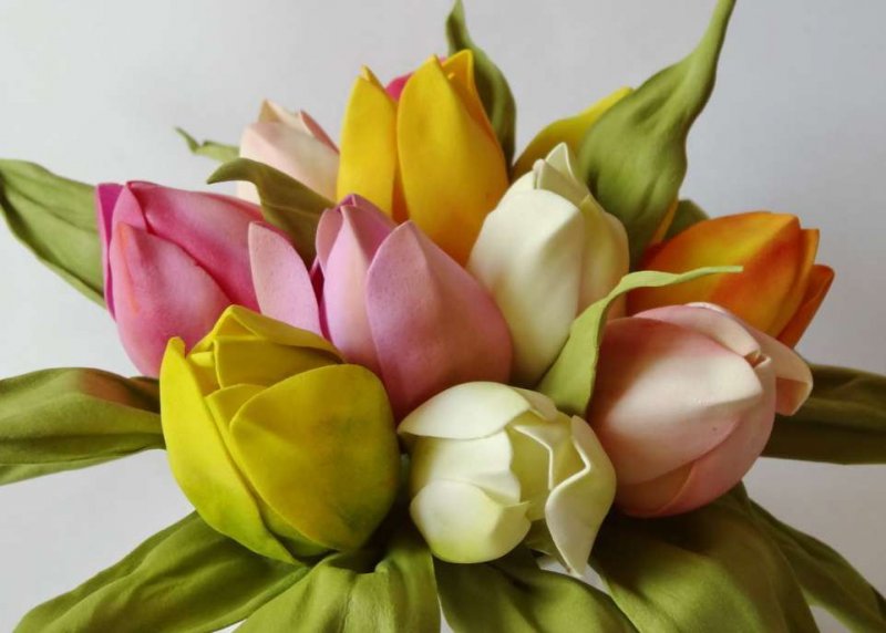 Сделать тюльпан из пластичной замши можно любого цвета, но лучше выбирать пастельные тона. Их проще тонировать художественной пастелью. Края можно обработать розовым цветом, а низ лепестка зеленым. После окраски частям будущего бутона надо придать волнистость – подержать возле утюга несколько секунд и сжать в спираль.