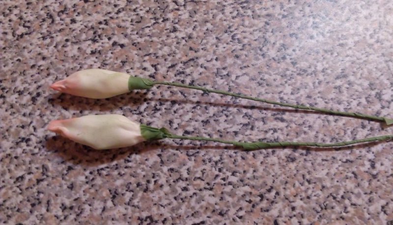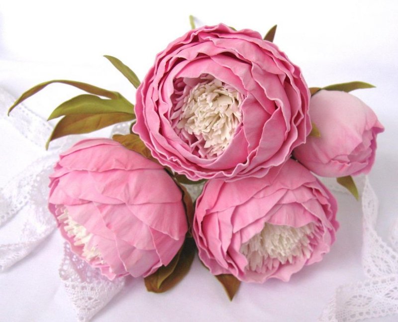Следующая работа заключается в покраске заготовок акрилом, нагревании, придании объема и чашевидной формы будущему пиону. Роль сердцевины будет играть обмотанная фоамираном бусина. На подготовленный и окрашенный в зеленый цвет стебель надо приклеивать поочередно лепестки, начиная с самых маленьких. Если необходимо создать для букета нераспустившийся цветок, лепестки клеят к бусине плотно, промазывая клеем половину детали.