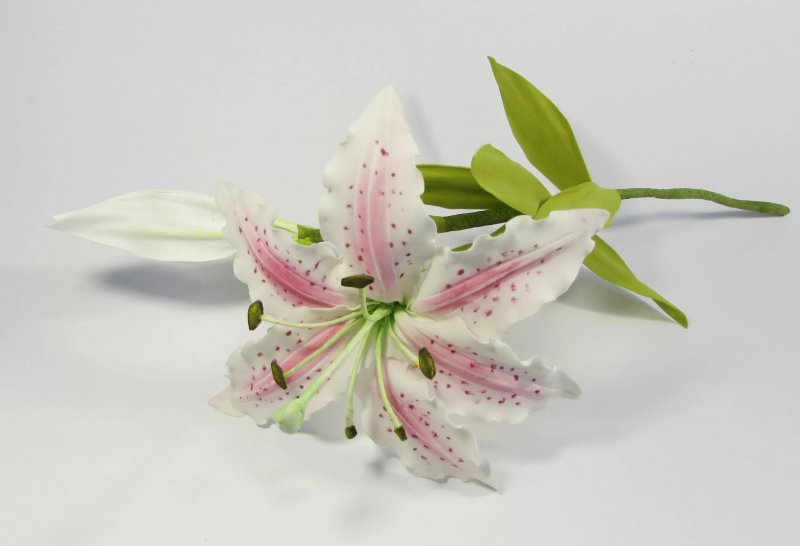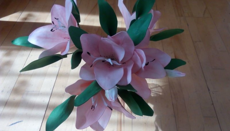 Заключительный шаг – сбор лепестков. Пестики и тычинки обматываем зеленой лентой. Затем необходимо приклеить три самых крупных лепестка, а между ними оставшиеся. Цветок лилии, нарцисса можно дополнить зелеными листами из фома, обработанными тем же методом.
