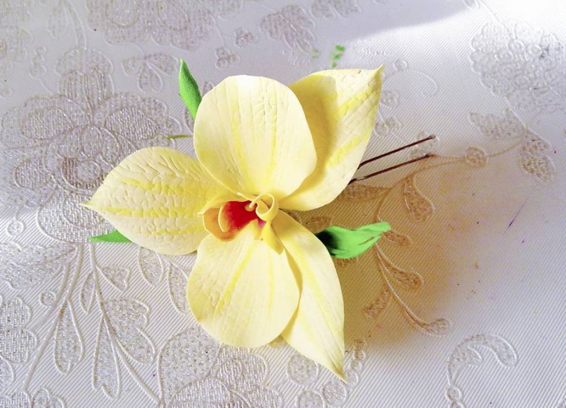 Сначала необходимо подготовить картонные шаблоны всех деталей поделки. Орхидею из фоамирана можно сделать в виде отдельного цветка, как украшение повязки, заколки или в виде оригинального декора в горшке. Средние лепестки делаем из материала на несколько тонов темнее, чем крайние. С помощью карандашей наносим характерные полоски и текстуру, согреваем в руках и растягиваем, придавая всем частям определенную форму.