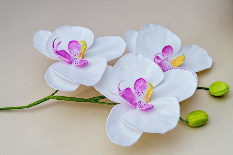 Дополнить композицию можно несколькими нераскрывшимися бутонами. Роль середины в этом случае играет свернутая фольга. Обклеиваем ее фоамираном и прикрепляем небольшие одинаковые лепестки. Стебли из проволоки можно обмотать зеленой лентой или крепированной бумагой. Все детали соединяем и помещаем на цветонос. Декоративная орхидея отлично смотрится в глиняном горшочке.