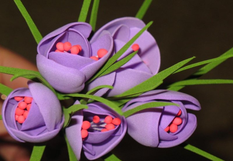Первые весенние цветы радуют своей красотой недолго, поскольку цветут всего несколько недель. Сохранить красоту красочных крокусов можно, сделав собственными руками практически точную копию растения из фоамирана. Идеальный размер выкройки – 5 сантиметров в высоту и 3 сантиметра в ширину. Прикладываем ее к пластичной замше и обводим заостренным предметом из расчета один цветок – 6 лепестков.