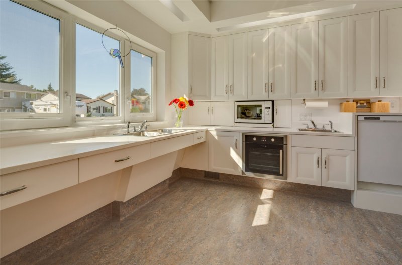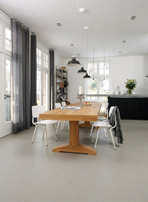 Кухонное помещение отличается высокой посещаемостью, является зоной интенсивного передвижения домочадцев. Здесь готовят еду, поэтому в пространстве постоянно меняется температура, влажность, в воздух попадают испарения. Соответственно, половой слой должен быть: