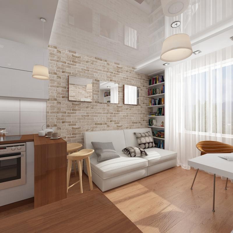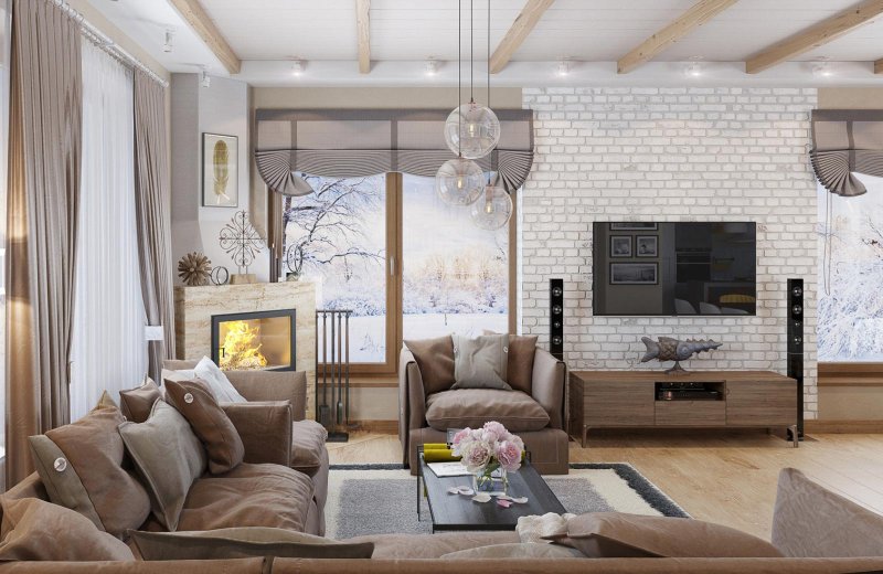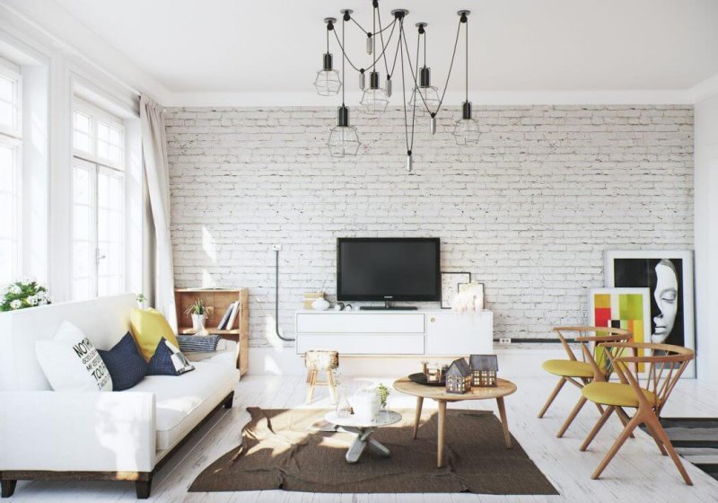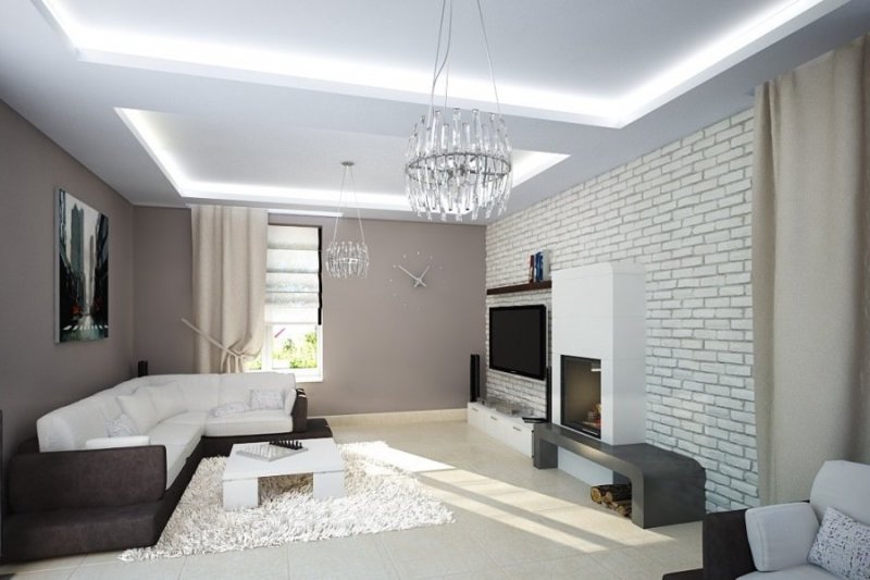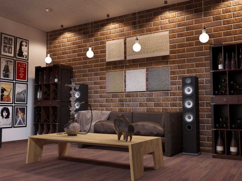 В зале наиболее часто кирпичной бутафорией оформляется не все помещение, а лишь одна его стена. Здесь органично смотрится камин или фальш-камин, выглядящий так, будто бы выполнен из настоящего кирпича, несколько зонирующих перегородок. Если гостиная полностью совмещена с кухней, то кирпичиками отделывается только кухонное либо гостиное помещение. Допустим вариант создания кирпичной разделительной полосы между отдельными зонами. Органично дополнят общую картину бутылки, коробочки, с нарисованными акрилом цветными кирпичиками, картинками, нанесенными в технике декупажа, выполненными при помощи обыкновенной шпатлевки.