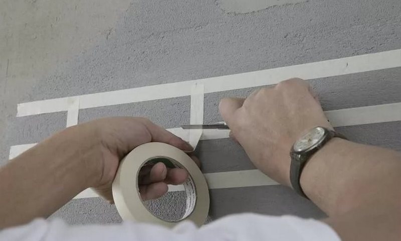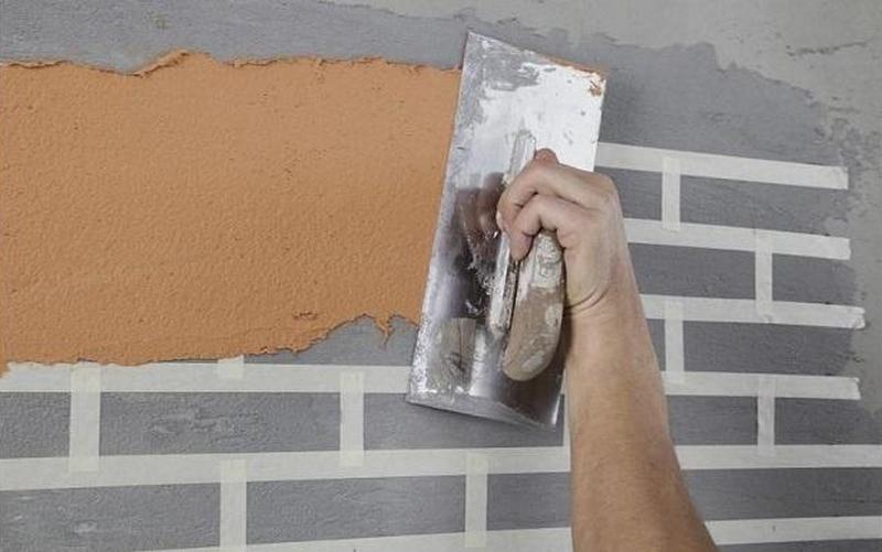 Далее на стенку наклеивается узкий скотч так, чтобы получилось нечто похожее на кирпичики. Поверх скотча и всей стены слоем в пять-восемь миллиметров наносится штукатурка, плиточный клей, ротбанд. После того, как раствор слегка схватится, скотч аккуратно отдирается, промежутки выравниваются при помощи деревянного стека, жесткой кисточки.