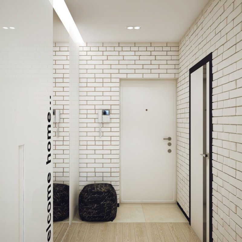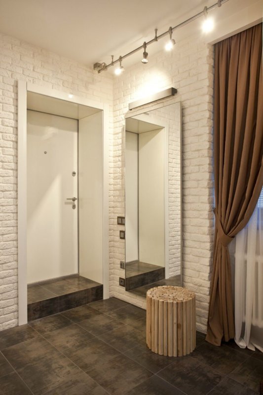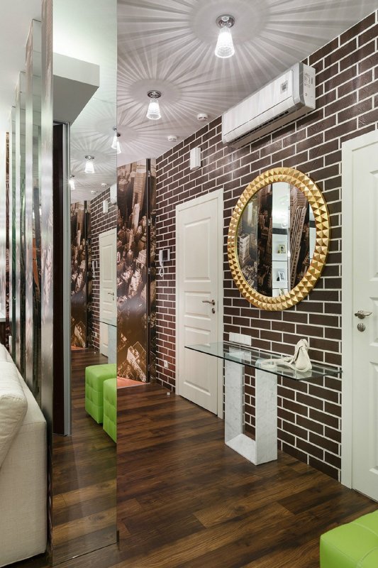Передняя или холл – своеобразное «лицо» квартиры, от него «пляшет» все интерьерное оформление. Здесь кирпичная отделка допустима по всем стенам, с редкими вкраплениями подходящего по смыслу декора – нарисованных веточек плюща, декоративных трещинок и др. Чрезмерно длинный коридор зонируется вертикальными кирпичными линиями, арками, расположенными на одинаковом расстоянии друг от друга – так достигается корректировка его формы, размеров, высоты.