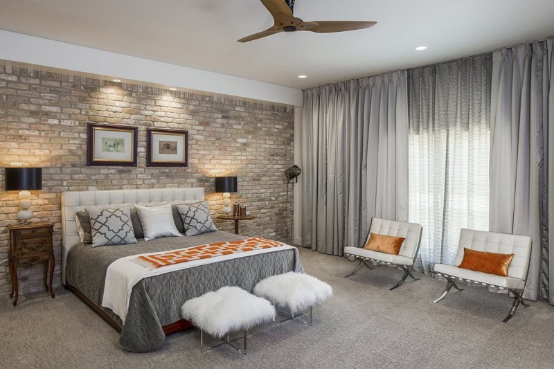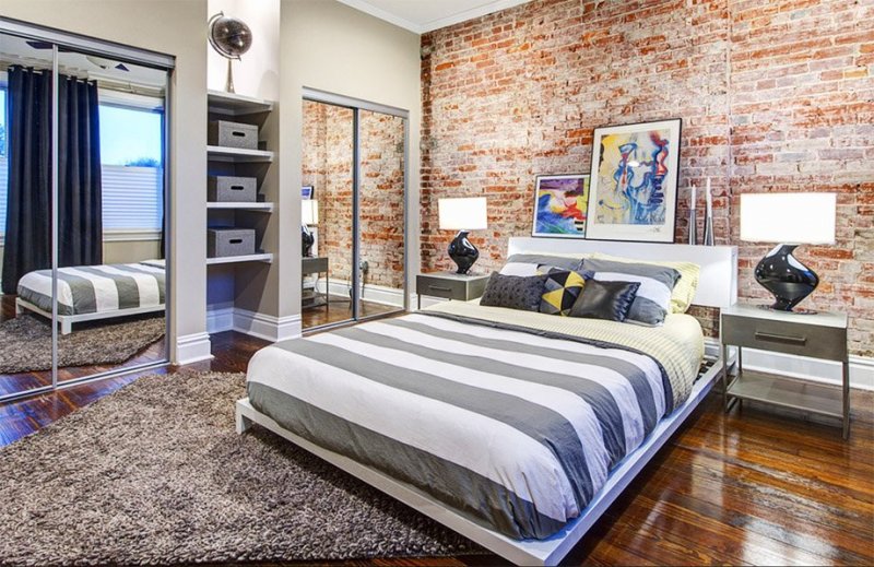В спальне кирпичным декором отделываются не только стены, но и подиум (при его наличии), на котором располагается спальное место. Такое же оформление позволит красиво зонировать большую комнату, отделав кирпичом только мини-кабинет или гардеробную зону. Наилучшим образом подойдут фотообои, керамическая плитка не рекомендуется – она слишком холодная.