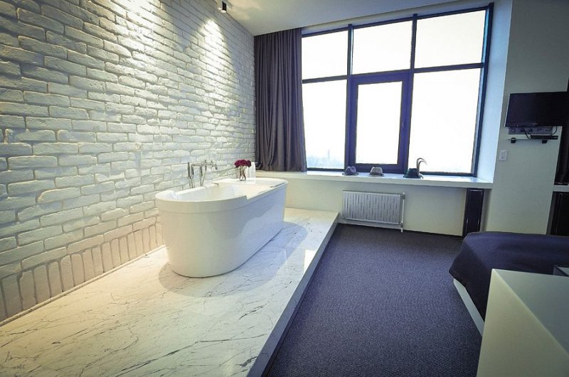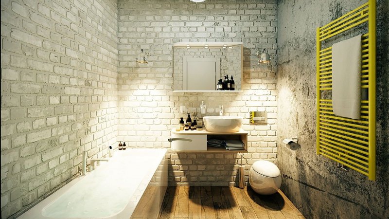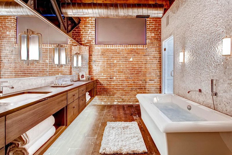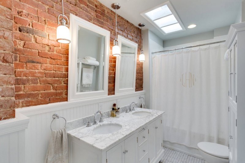 К имитации кирпича в помещении санузла предъявляются особые требования – она должна быть влагостойкой, не разрушаться, не деформироваться при прямом попадании воды. Здесь подойдет керамическая либо гибкая плитка прямоугольной формы, пенопласт, окрашенный влагоустойчивой краской. Расцветка зависит от размера комнаты – чем она теснее, тем светлее выбирается покрытие.