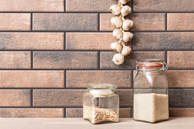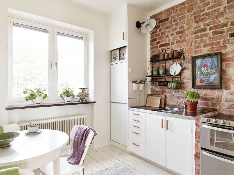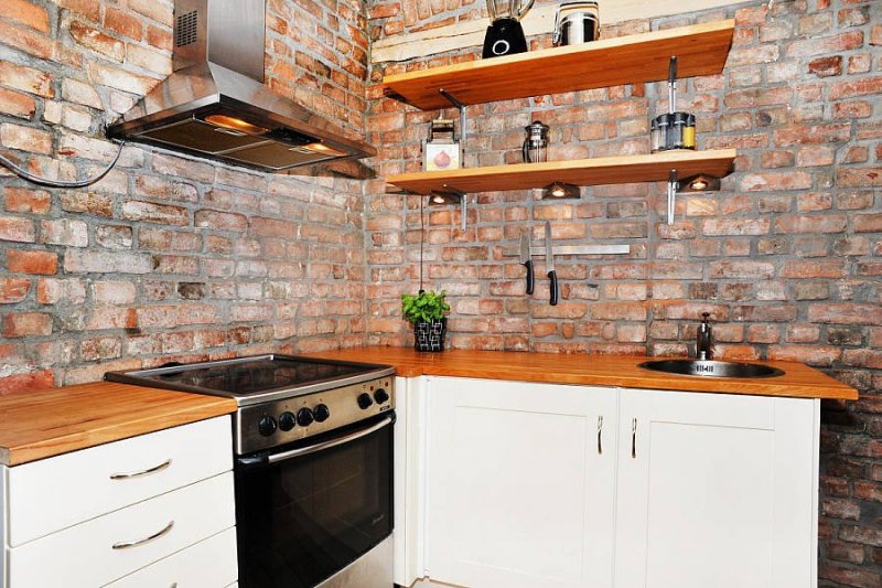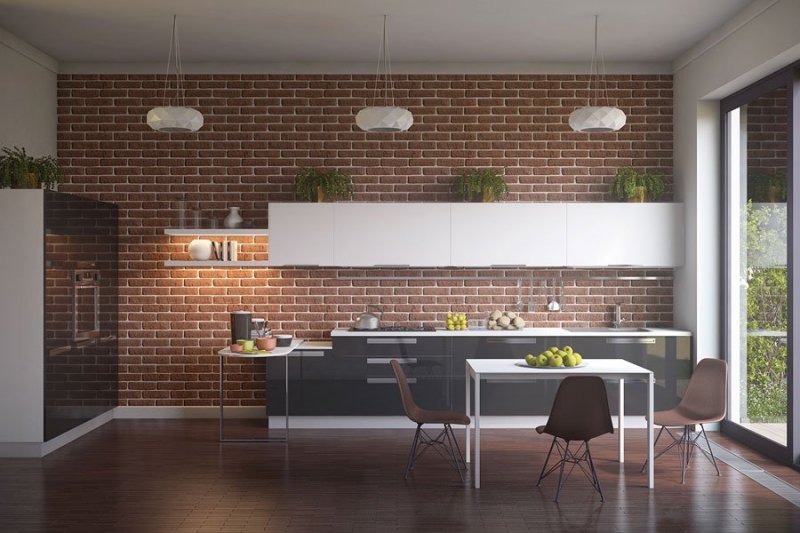 Имитацией кирпича для данного помещения оформляется кухонный фартук, выполняемый из пластика, стекла, с нанесенным на него рисунком. Все материалы должны быть водостойкими, что особенно актуально для зоны около раковины, газовой плиты, легко очищаться от жира без использования жестких абразивных веществ, агрессивных моющих средств.