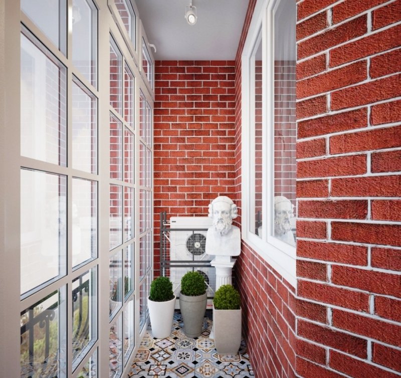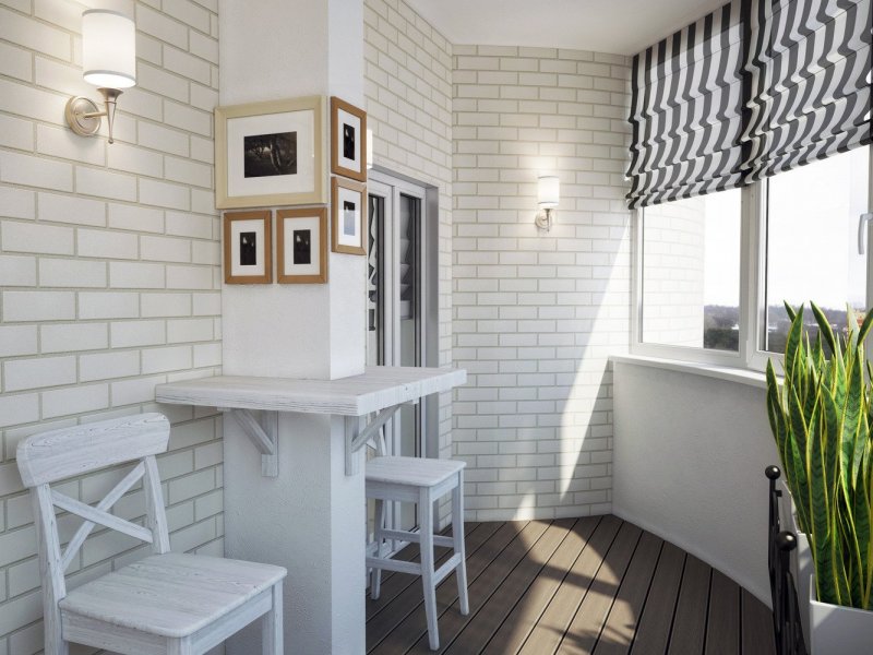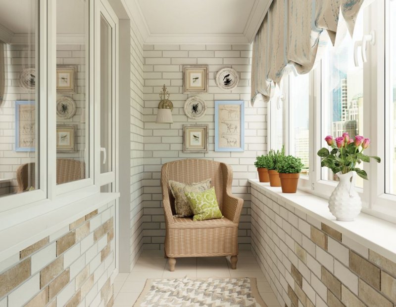 Утепленный, застекленный балкон, просторная лоджия могут объединяться с любой комнатой – спальней, кухней, гостиной посредством одинакового покрытия с основным помещением. Как вариант: комната отделывается белым или желтым нарисованным кирпичом, балкон – более темной имитацией из штукатурки. Здесь наиболее часто используются пластиковые панели вместе с утеплителем из пенопласта, полиуретана, минеральной ваты и др.