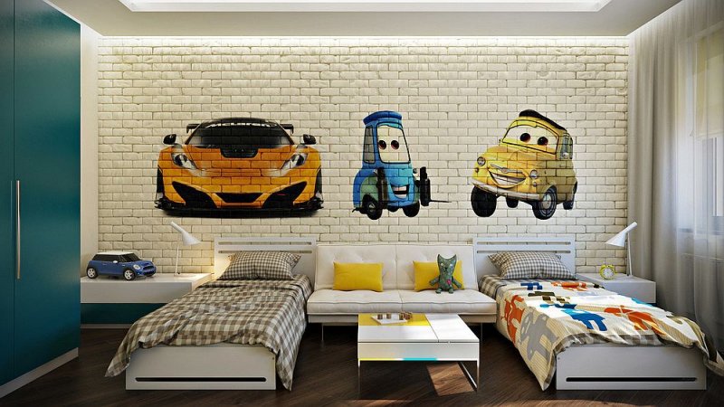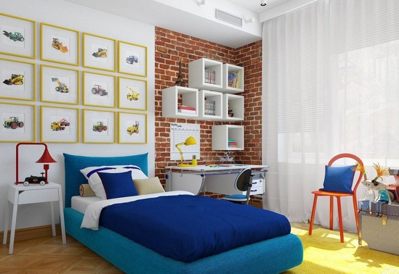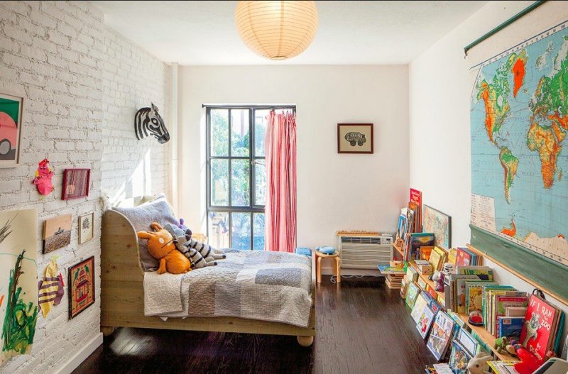 Для детской кирпичный декор применяется редко, смотрится не менее органично, чем в других помещениях. Данное оформление часто применяется в подростковых комнатах – индастриал, лофт, поп-арт и тому подобные стили практически в чистом виде наиболее органично смотрятся именно там. Украсить таким образом комнату можно вместе с детьми, просто изобразив кирпичики при помощи акриловых красок, акварели, гуаши, маркеров. Эффект старого кирпича получится, если кое-где прорисовать мелкие трещинки гелевой ручкой.