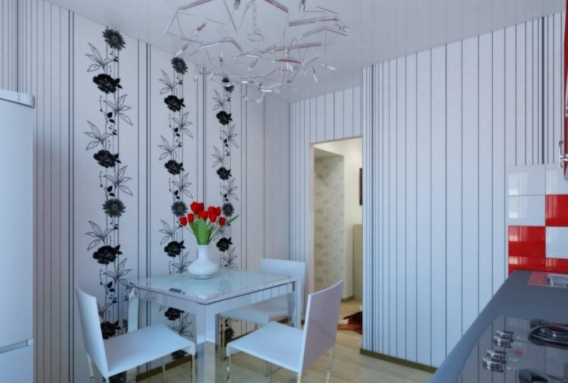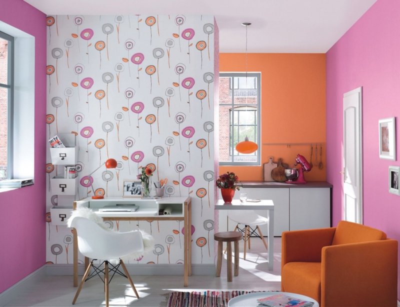 Решения бывают довольно необычными. Разделения добиваются не только цветом, но и фактурой. Один из вариантов – отделить, например, кухню от столовой, оклеив ее структурными обоями под покраску. Какую-то зону украшают цветочным орнаментом, а соседнюю – клетчатым принтом той же гаммы. Главным будет не ошибиться с расстановкой мебели.
