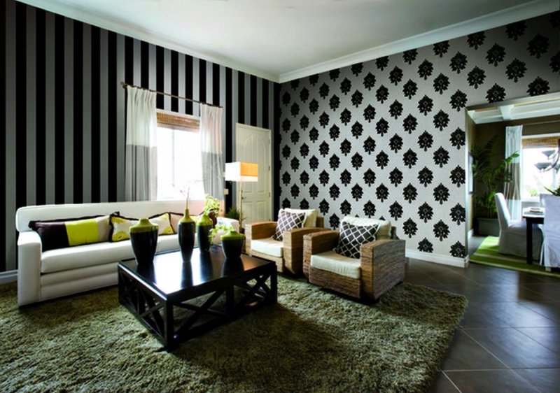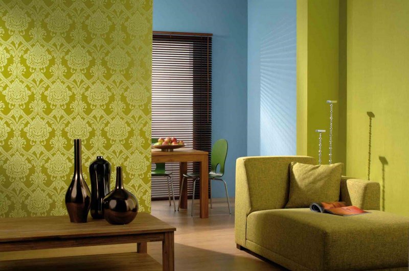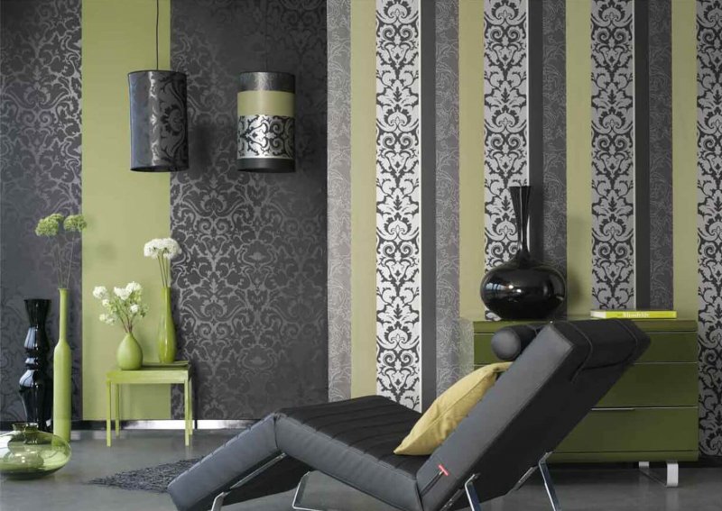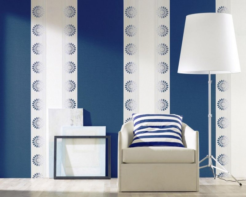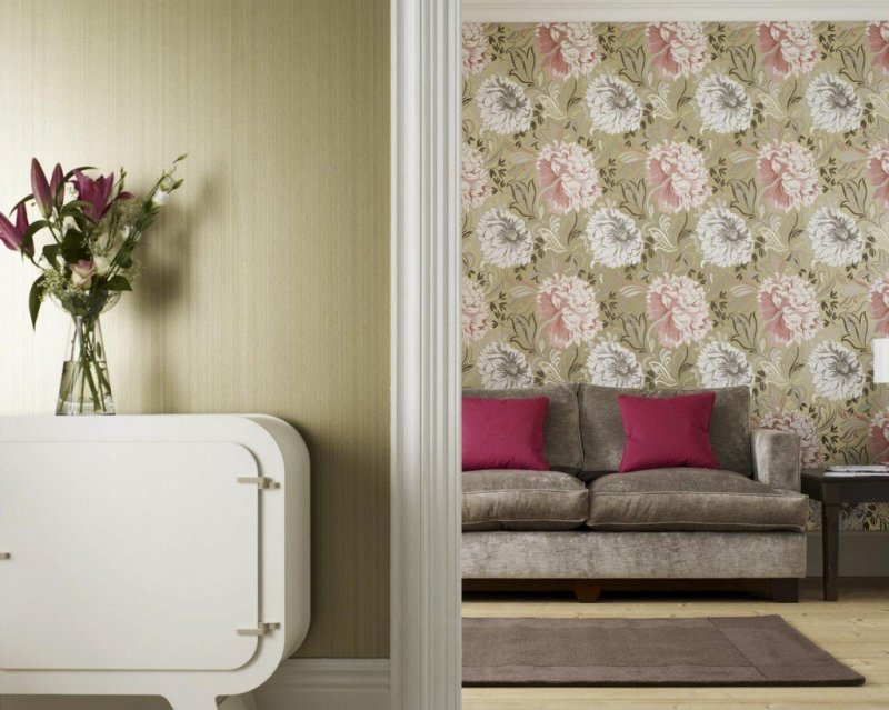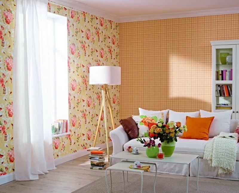 Популярны сочетания покрытий одного цвета, но разной интенсивности, чередование динамичных оттенков со спокойными, обоев с узорами и гладкоокрашенных. Цветочки с полосками хорошо смотрятся в ретро-стиле.