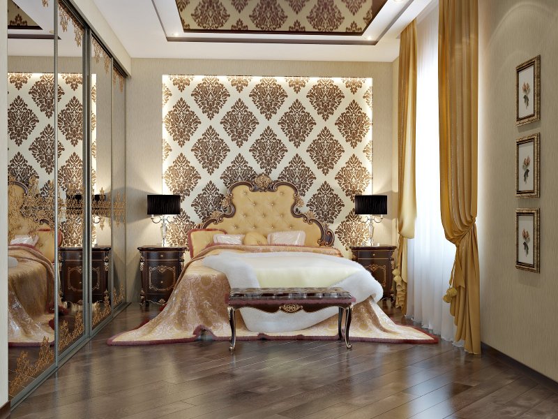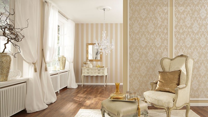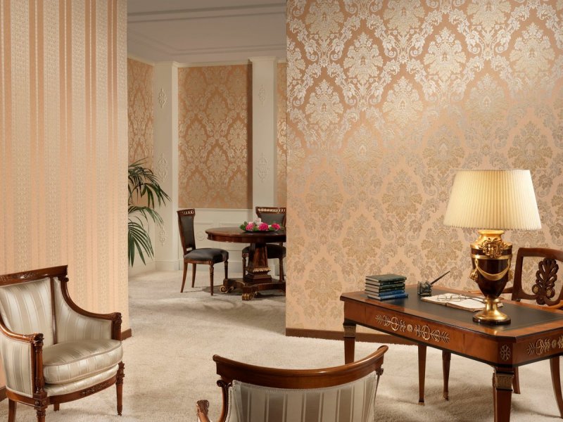 Пышность рококо и барокко подчеркнет шелкография, обои на тканевой основе. Бумажные фотообои помогут сымитировать тканые шпалеры. Вместо лепнины пойдут помпезные молдинги.