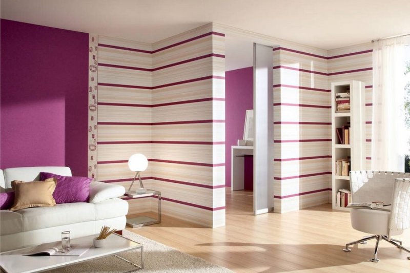 Горизонтальные полосы могут распределяться по всей высоте, чередуясь по цвету, рисунку. Если решают поклеить только два вида обоев, то части должны составлять пропорцию 2:1.
