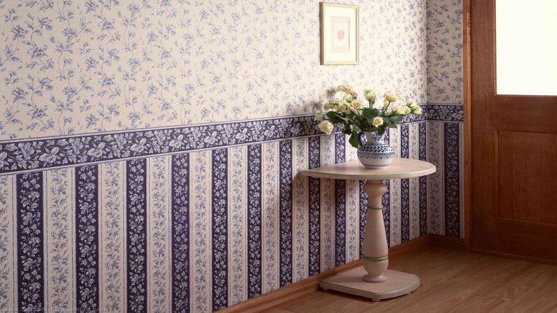 Метод наиболее удачен, если обклеивать комнату обоями разного типа, к примеру, верхнюю часть бумажными, а нижнюю – рельефными виниловыми либо флизелиновыми. Стены получат дополнительную защиту, провести частичный ремонт будет проще и дешевле.