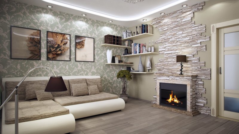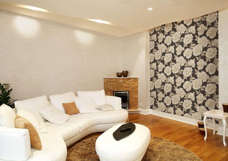 Зону отдыха обычно делают более светлой, оформляя однотонными полотнами или с мелким рисунком. Место, где располагается мягкая мебель, каминная группа, плазма выиграет при оформлении более насыщенными цветами, красивыми рисунками.