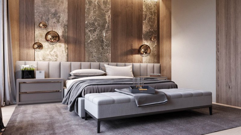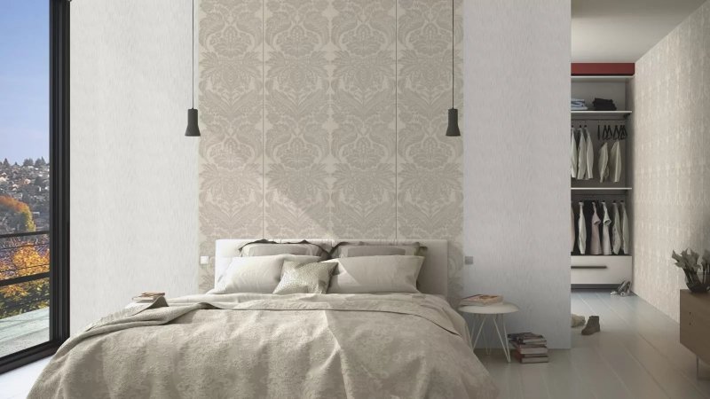 Сочетая разные виды обоев, изголовье оклеивают фактурными, более темными материалами, фотообоями, делают на нем акцент. С целью обособить спальное место акцентную полосу продолжают по потолку.
