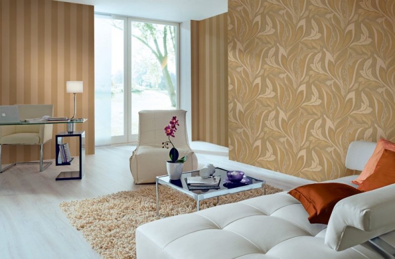 Зал чаще всего несет функции гостиной и столовой, иногда спальни. Какой-то из уголков может быть рабочей зоной или библиотекой. Обои-партнеры помогут разделить пространство на зоны. Главную скрипку играют размеры помещения. Если гостиная небольшая, лучше прибегнуть к светлым оттенкам. На обширных просторах фантазию можно не ограничивать, экспериментировать с текстурами, расцветками.