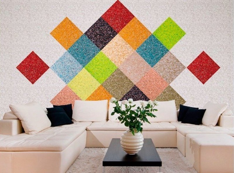 Наиболее приемлемые комбинации те, которых добиваются с помощью игры с цветом. Жидкие обои просто совмещать друг с другом, другими материалами, дополнять рисунками, оригинальными узорами. Из них создают панно, а если «замесить» погуще, то и декоративные объемные элементы, например, имитацию лепнины.