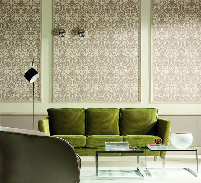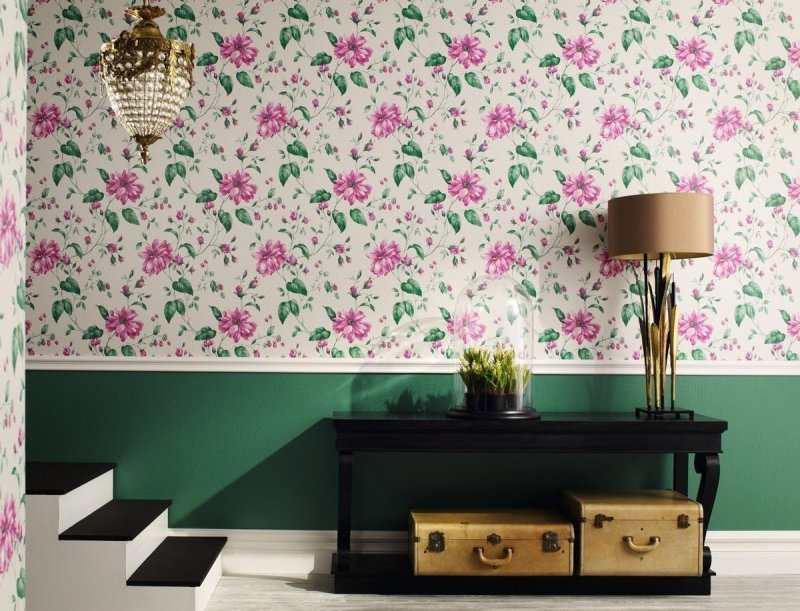 Прием часто используется при горизонтальном комбинировании, когда нижняя часть стены, например, оформляется обоями с орнаментом, а верхняя, более светлая, украшена мелкими цветками. Точно так же можно скомпоновать крупные вензеля или растительный узор с неброской геометрической рябью, производящей впечатление однотонного фона.