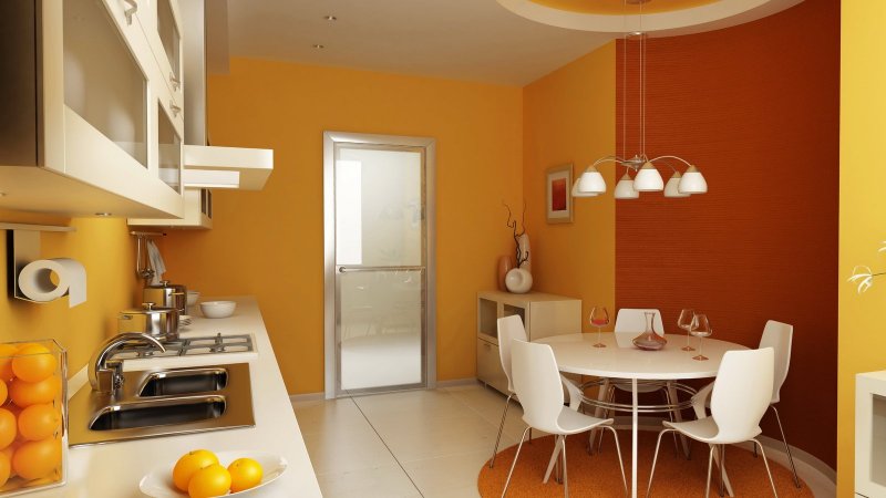 Чтобы не перенасытить кухонное помещение красками, обойный дуэт нужно сделать нейтральным, без крупных узоров. Большую кухню-столовую оформляют более ярко, но здесь все-таки более гармонично будут смотреться пастельные оттенки, светлые тона, если рисунки, то мелкие.