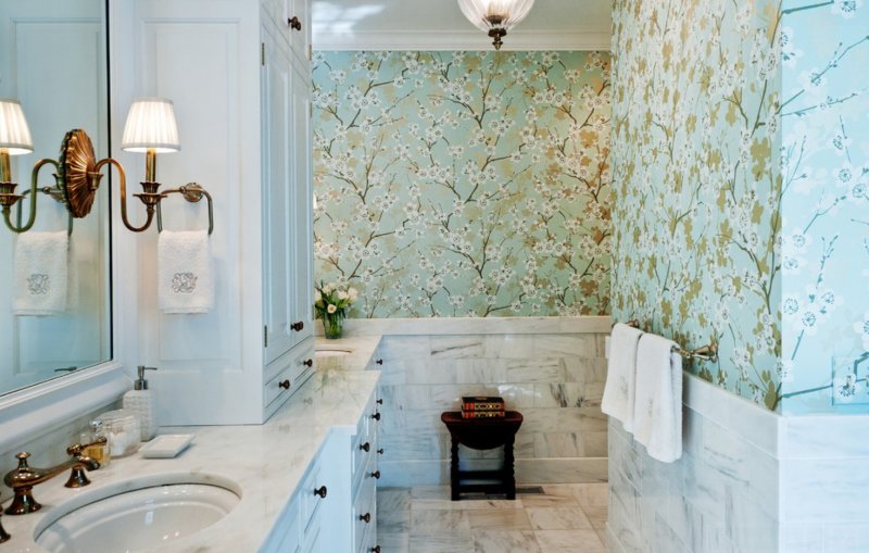 Микроклимат комнаты не располагает к оклейке ее обоями. Здесь больше уместны другие покрытия, которые хорошо противостоят влаге. Но если ванная просторная, хорошо проветривается, то ее вполне можно оформить частично и обоями, тем более что полотна легко сменить, если вдруг окажется, что они слегка отклеились.